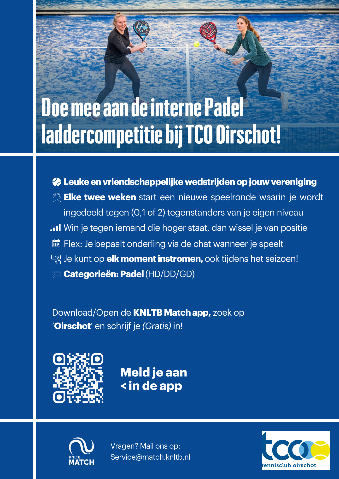 De interne padel laddercompetitie gaat bijna van start! Dit is de enige competitie waarin je zelf bepaalt wanneer je speelt, dus het komt altijd uit. Bovendien speel je altijd thuis, en leer je nieuwe spelers kennen binnen de vereniging van jouw niveau.
